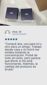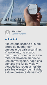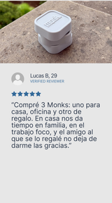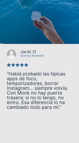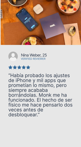 Monk es un dispositivo físico, no otra app más. Eso crea una barrera real y tangible entre tú y tus distracciones. Al tocar el Monk, se bloquean las apps que hayas elegido y no se desbloquean hasta que vuelvas a tocarlo. Tienes que tener el dispositivo contigo.